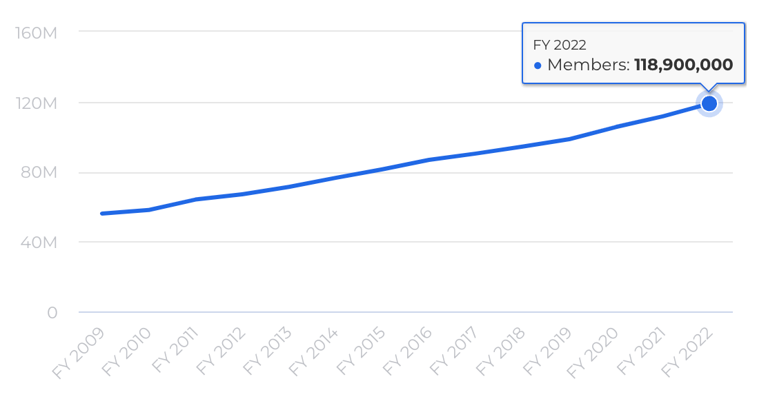Costco's membership base continued to grow in the fiscal year 2022, reaching 118.9 million members. The company's ability to attract and retain members is a key driver of its revenue growth and profitability. Memberships are a significant source of recurring revenue for the company and also provide valuable customer data that helps the company to better understand its customer's needs and preferences. Costco's member renewal rate was 93% in the U.S. and Canada and 90% worldwide at the end of 2022.
