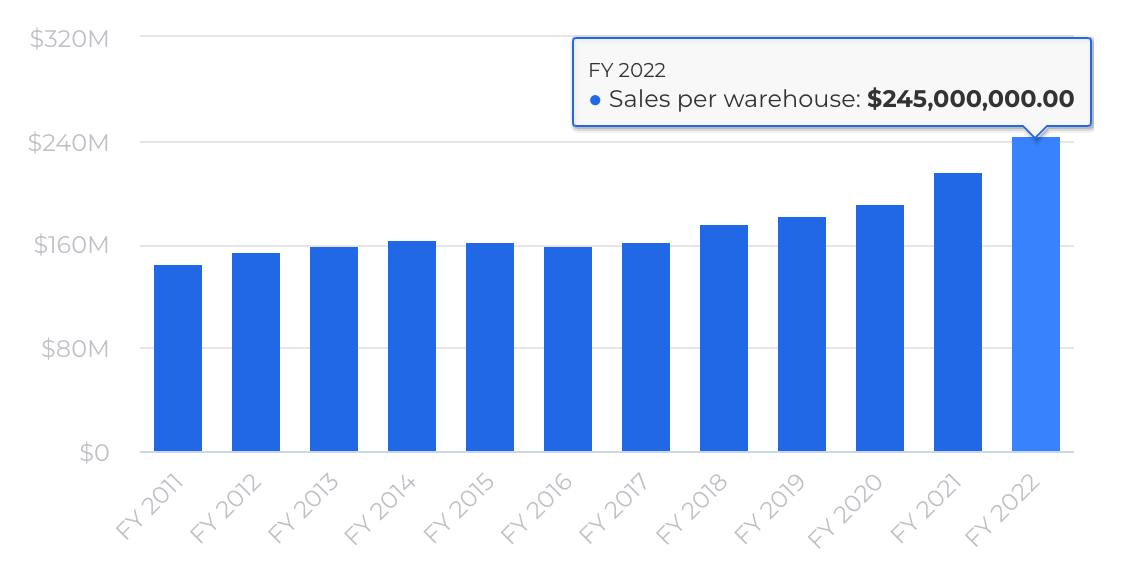 - Net sales increased 16% to $222.73B driven by a 14% increase in comparable sales and sales at new warehouses opened in 2021 and 2022