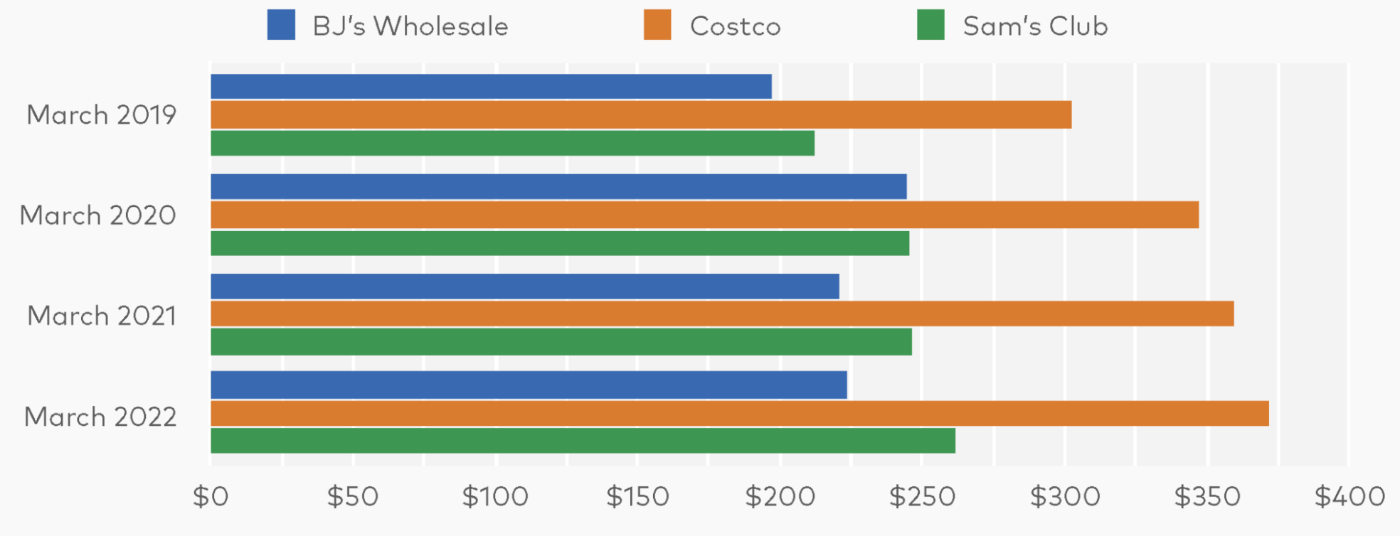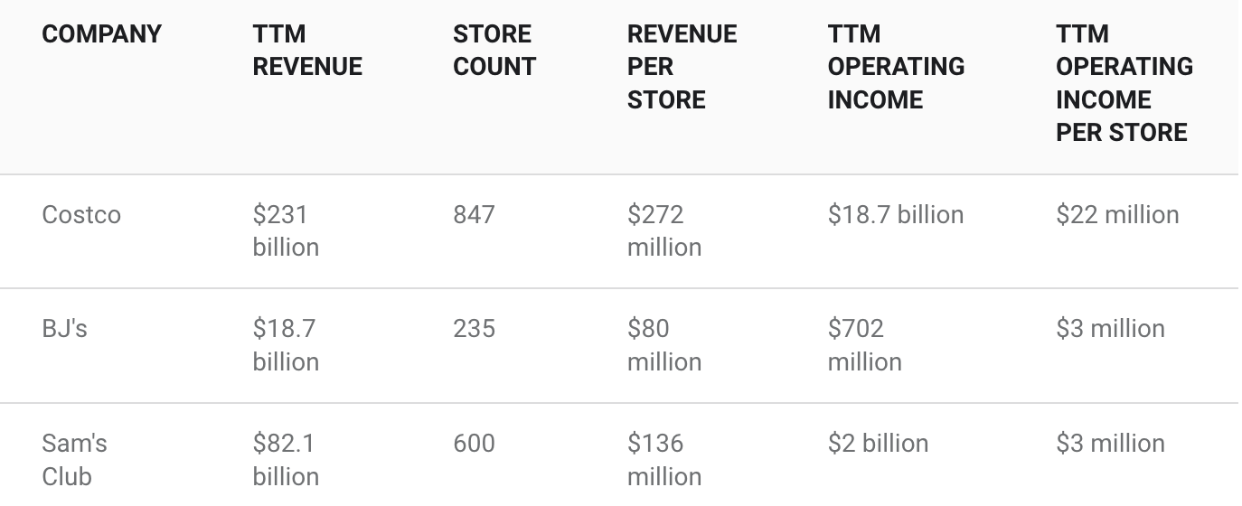BJ's is a much smaller company, with 235 stores versus Costco's 847; Sam's Club operates 600 stores. Costco is the largest of the three, but Sam's Club isn't too far behind. However, Costco's average sales and income per store far exceed the other two. The below-mentioned data are as of Jan 24, 2023.