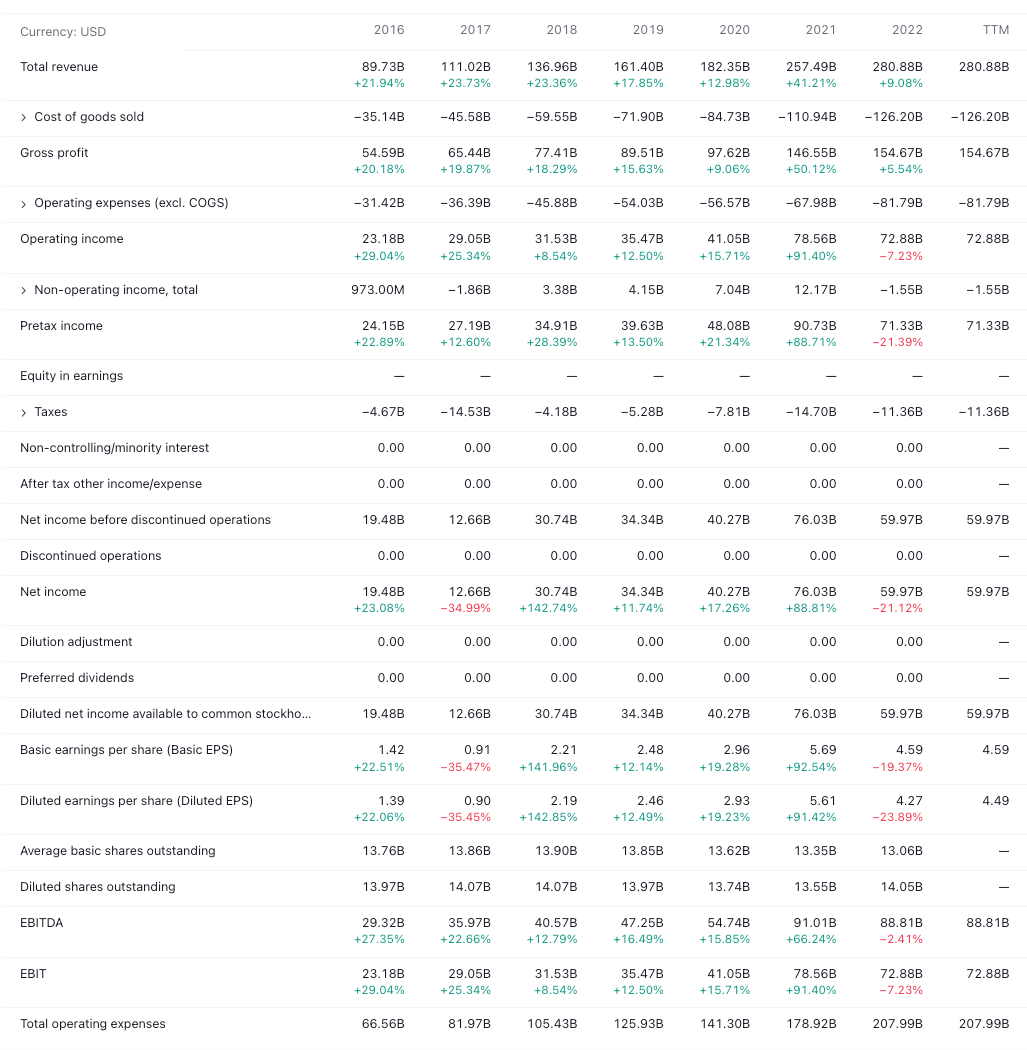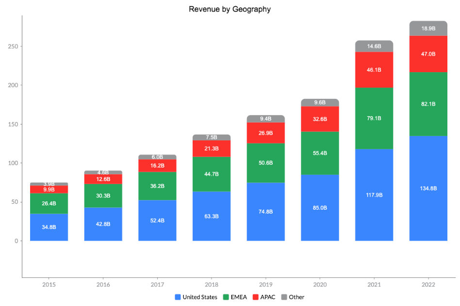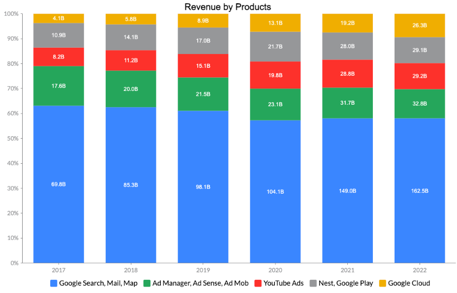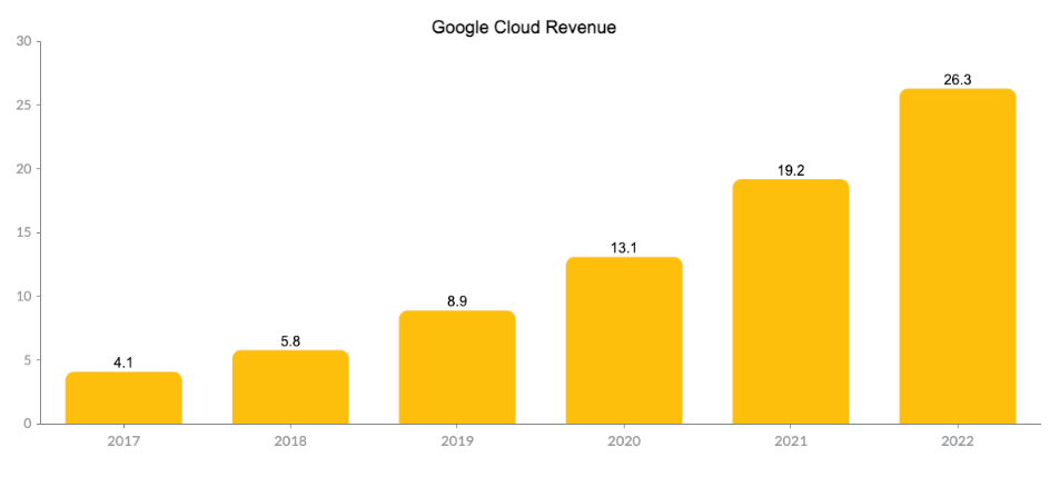 Google Cloud represents another growth opportunity for Alphabet. Precedence Research predicts that the public cloud computing market will expand at a nearly 17% annual rate, increasing from $380B in 2021 to $1.6T by 2030. Google Cloud Platform holds a 9% market share, trailing behind Amazon's AWS (32%) and Microsoft's Azure (20%), making it a fiercely competitive landscape. Nevertheless, Google Cloud's revenue experienced a substantial 37% increase in 2022 compared to the previous year, reaching $26.3B. This growth follows an impressive annual revenue increase of 45% for Google Cloud between 2017 ($4.1B) and 2022 ($26.3B). We believe that the overall growth of the cloud computing sector will benefit multiple players, including Google Cloud.
