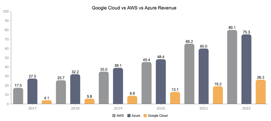 Google Cloud has established strategic partnerships with key industry players such as Cisco, SAP, and Salesforce, which bolsters its credibility and reach. It has also attracted a diverse customer base, including high-profile clients like Spotify, Twitter, and Snap Inc. Google Cloud is a leading player in the cloud computing market. It is the third-largest cloud provider by market share, after Amazon Web Services (AWS) and Microsoft Azure. Google Cloud is growing rapidly, and it is expected to continue to grow in the future and closing the gap in market shares with AWS & Azure.
