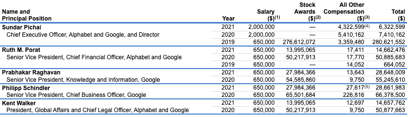 The majority of the total compensation of Alphabet’s key leaders came from PSUs and GSUs (Google Stock Unit) which is designed to align their interests with those of shareholders.