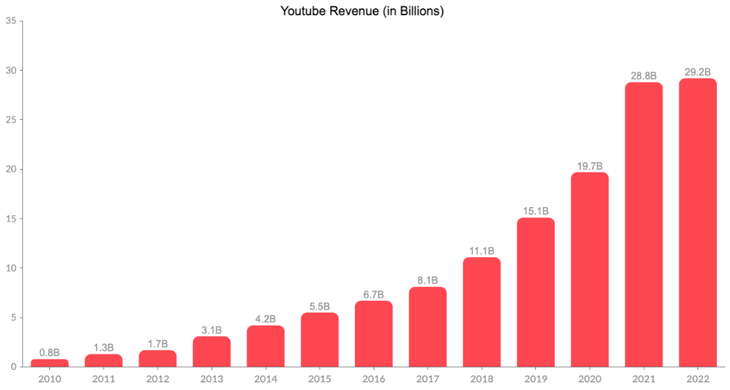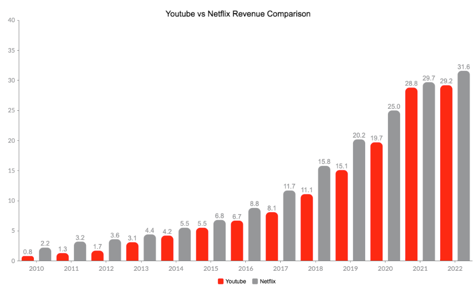 YouTube has over 2.6 billion active users, while Netflix has over 230 million subscribers. YouTube's larger user base and global reach provide it with a significant advantage in terms of potential growth, especially as it expands its monetization efforts through subscriptions and other revenue streams. In terms of revenue, Netflix generated $31.6 billion in revenue in 2022, while YouTube generated $29.2 billion. However, YouTube is growing its revenue faster than Netflix. Youtube is closing the gap slowly. YouTube's revenue grew by 29% from 2017 to 2022, while Netflix's revenue grew by just 22% for the same period. Similarly, YouTube's profitability is increasing faster than Netflix's.