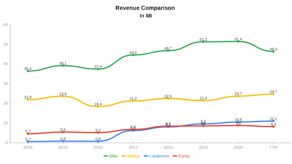 - Nike remains far ahead, with revenue more than double Adidas and many multiples larger than Lululemon and Puma. Despite a recent pullback, its scale advantage remains intact.