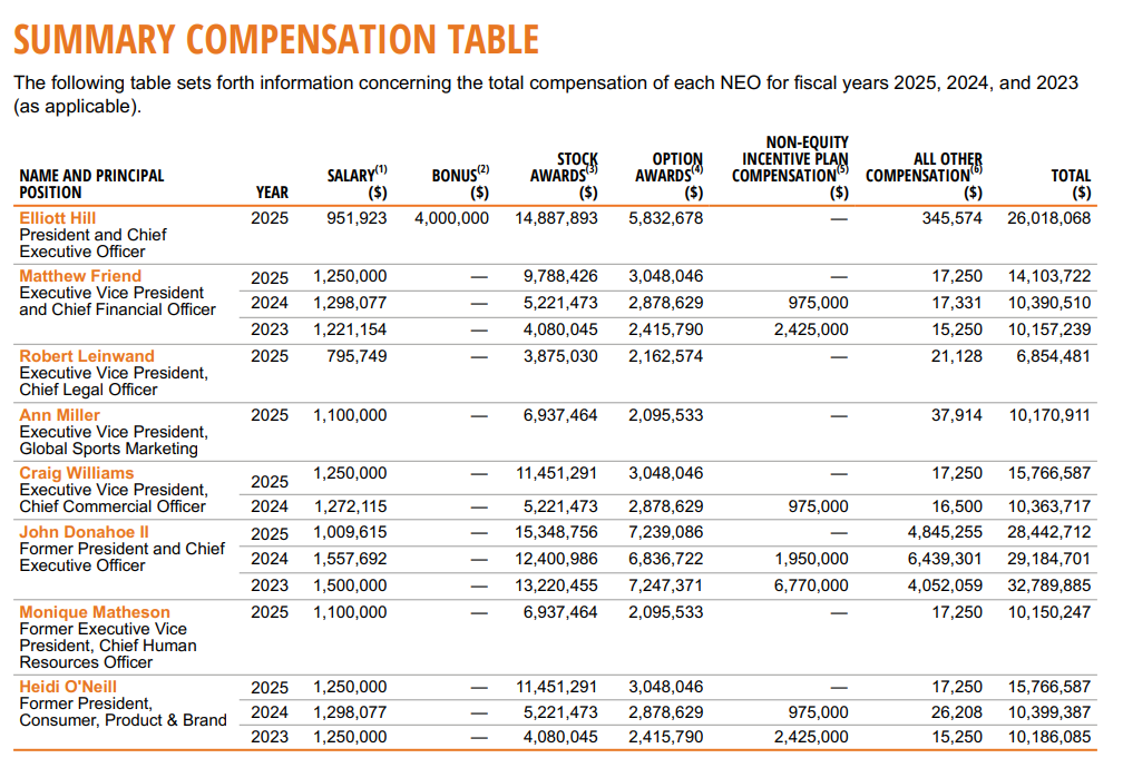 Overall, Nike’s executive compensation structure prioritizes long-term equity incentives, internal alignment, and shareholder interests. While total compensation levels are substantial, they are closely tied to stock-based rewards and performance outcomes, reinforcing management accountability for executing Nike’s long-term growth strategy and navigating cyclical pressures in a highly competitive global market.