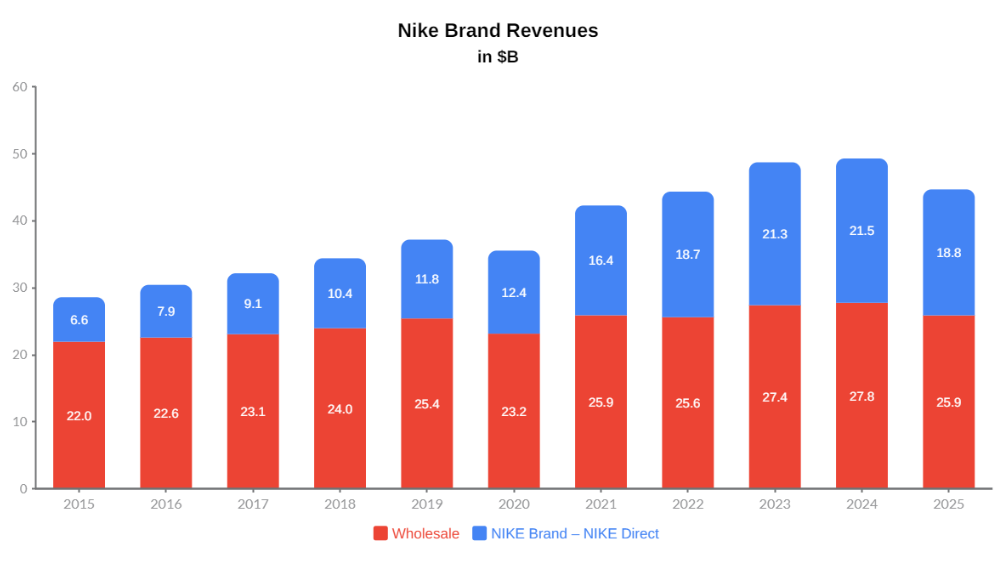 Overall, the ten-year Nike Brand revenue trend highlights a business that has successfully scaled through a dual-channel model, with wholesale providing global reach and NIKE Direct driving long-term margin and brand strength. While fiscal 2025 represents a period of reset, the underlying channel mix and brand fundamentals remain intact, positioning Nike Brand for more sustainable growth once macro and inventory pressures ease.