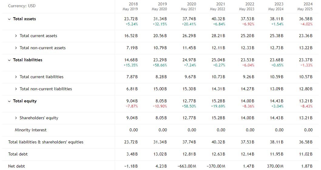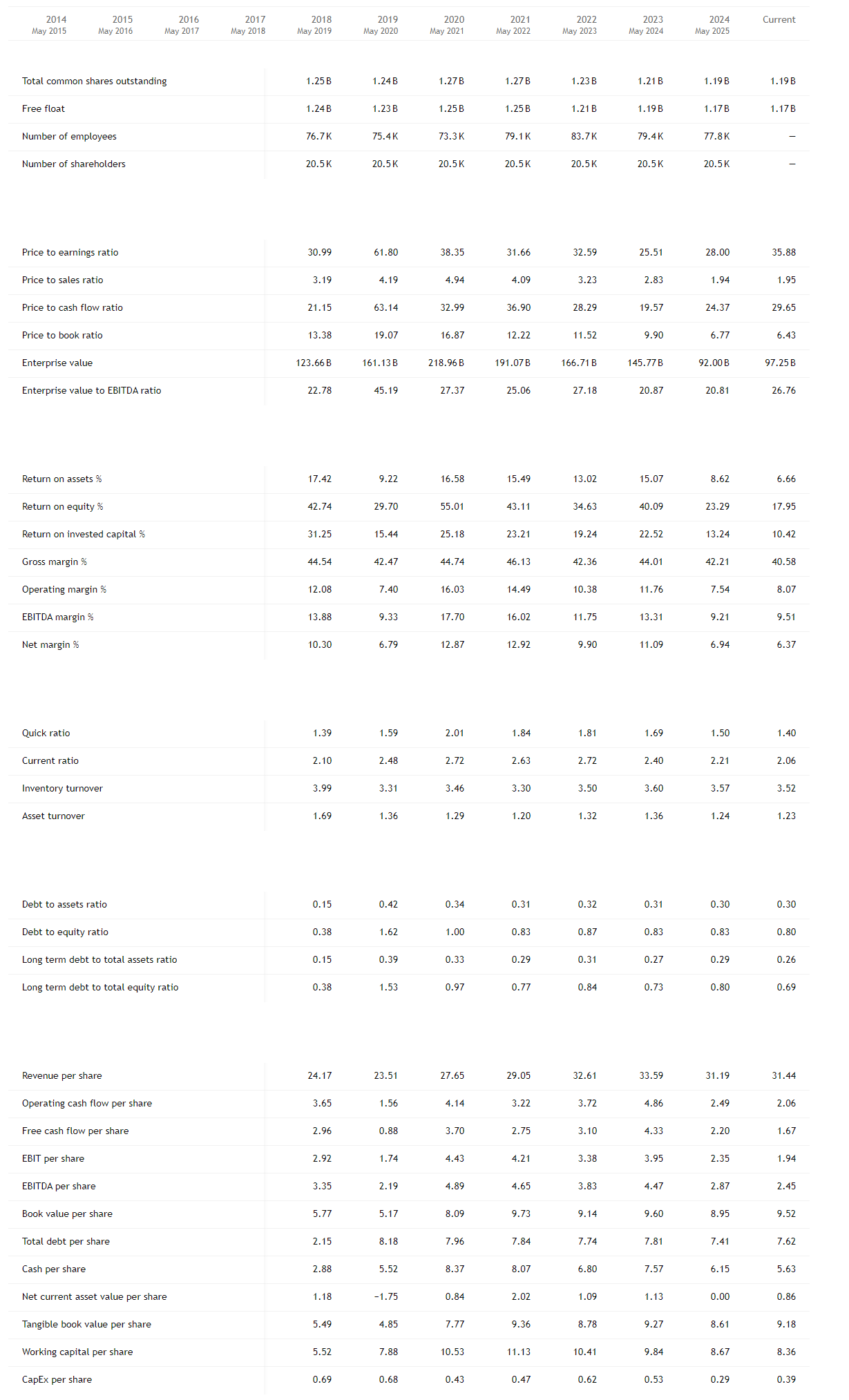 Over the past decade, Nike’s gross margin has generally fluctuated within a mid-40% range, underscoring the brand’s historically strong pricing power and premium positioning. Margins were strongest in periods where demand was healthy, inventory was well balanced, and direct-to-consumer penetration increased.