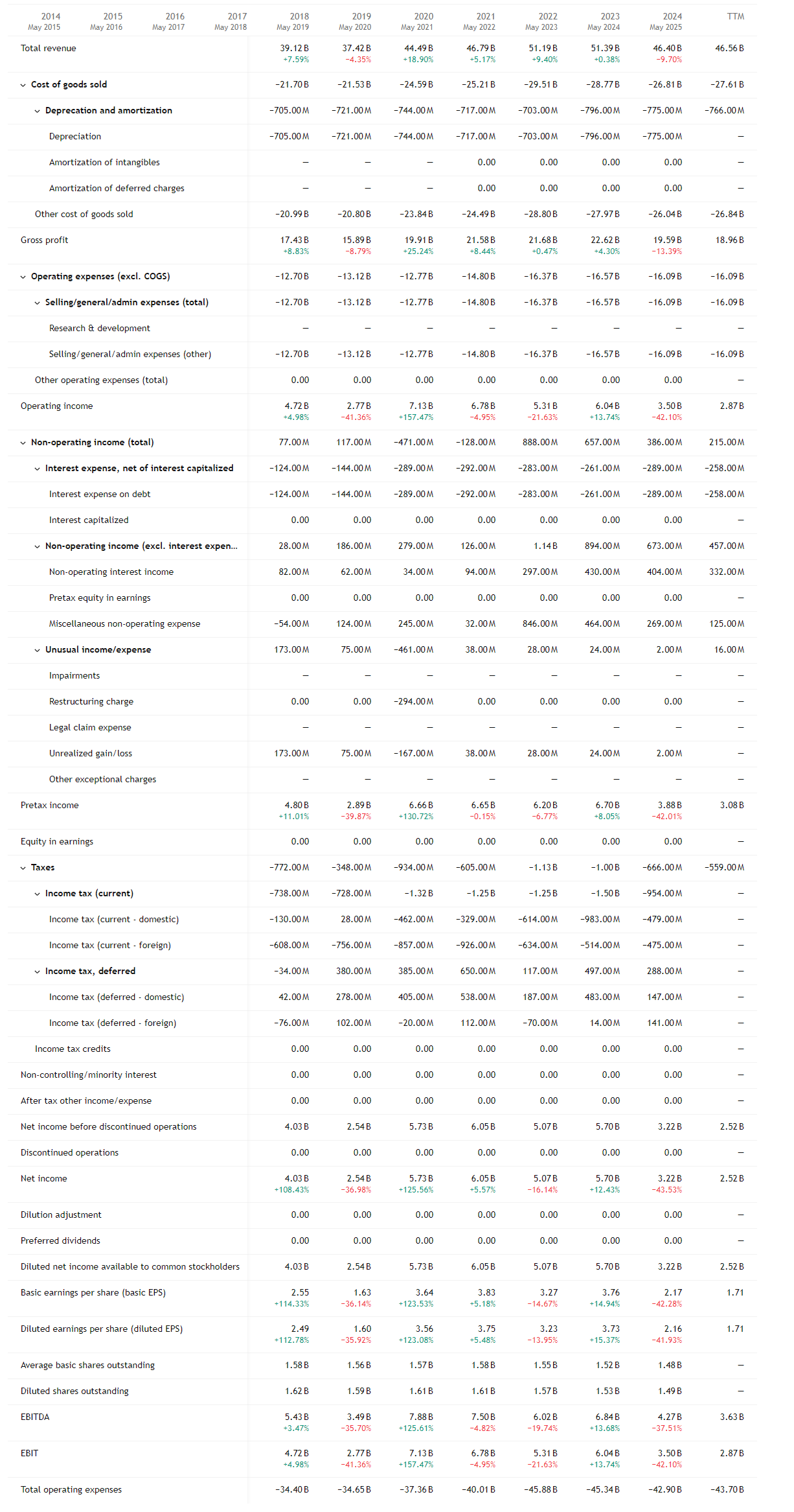 Over the past decade, Nike’s revenue trajectory reflects a structurally growing global brand, punctuated by cyclical disruptions and more recent normalization. From fiscal 2015 through 2019, Nike delivered steady, consistent top-line growth, expanding from roughly $31 billion to $39 billion as global sports participation rose, international markets scaled, and athleisure moved firmly into the mainstream. This period highlighted Nike’s ability to compound growth through brand strength, product innovation, and geographic expansion.