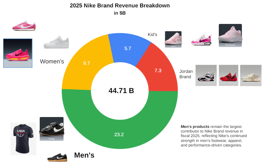 Nike’s product offering spans footwear, apparel, and select equipment and accessories, serving men, women, young athletes, and children, with men accounting for the largest share of revenue. Its portfolio is organized across performance and lifestyle categories, with Running, Jordan Brand, and Sportswear representing the most meaningful revenue contributors. This mix enables Nike to balance more cyclical, sport-specific demand with steadier lifestyle-driven sales.